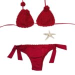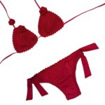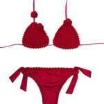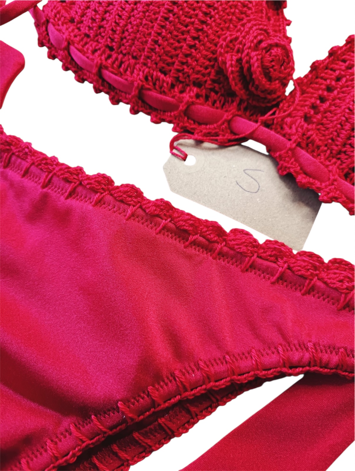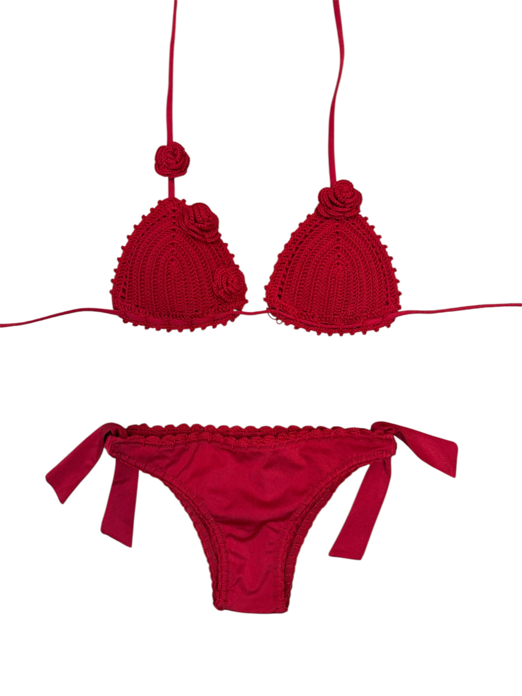 Lo slip in lycra è rifinito lungo tutti i bordi a crochet, con fiocchi laterali.