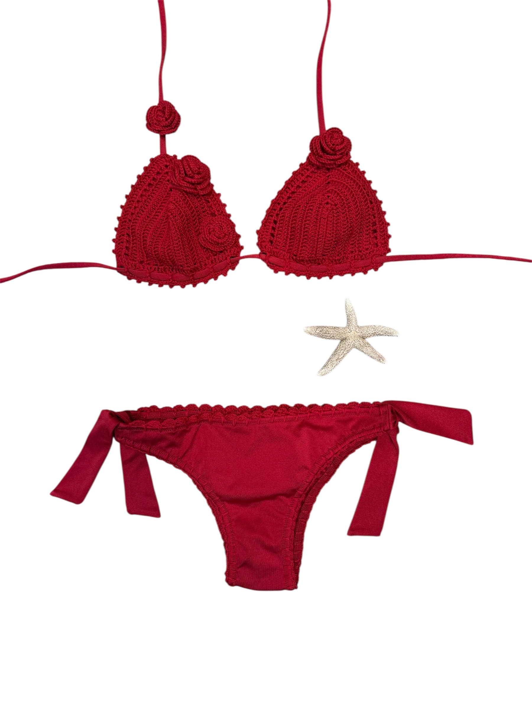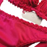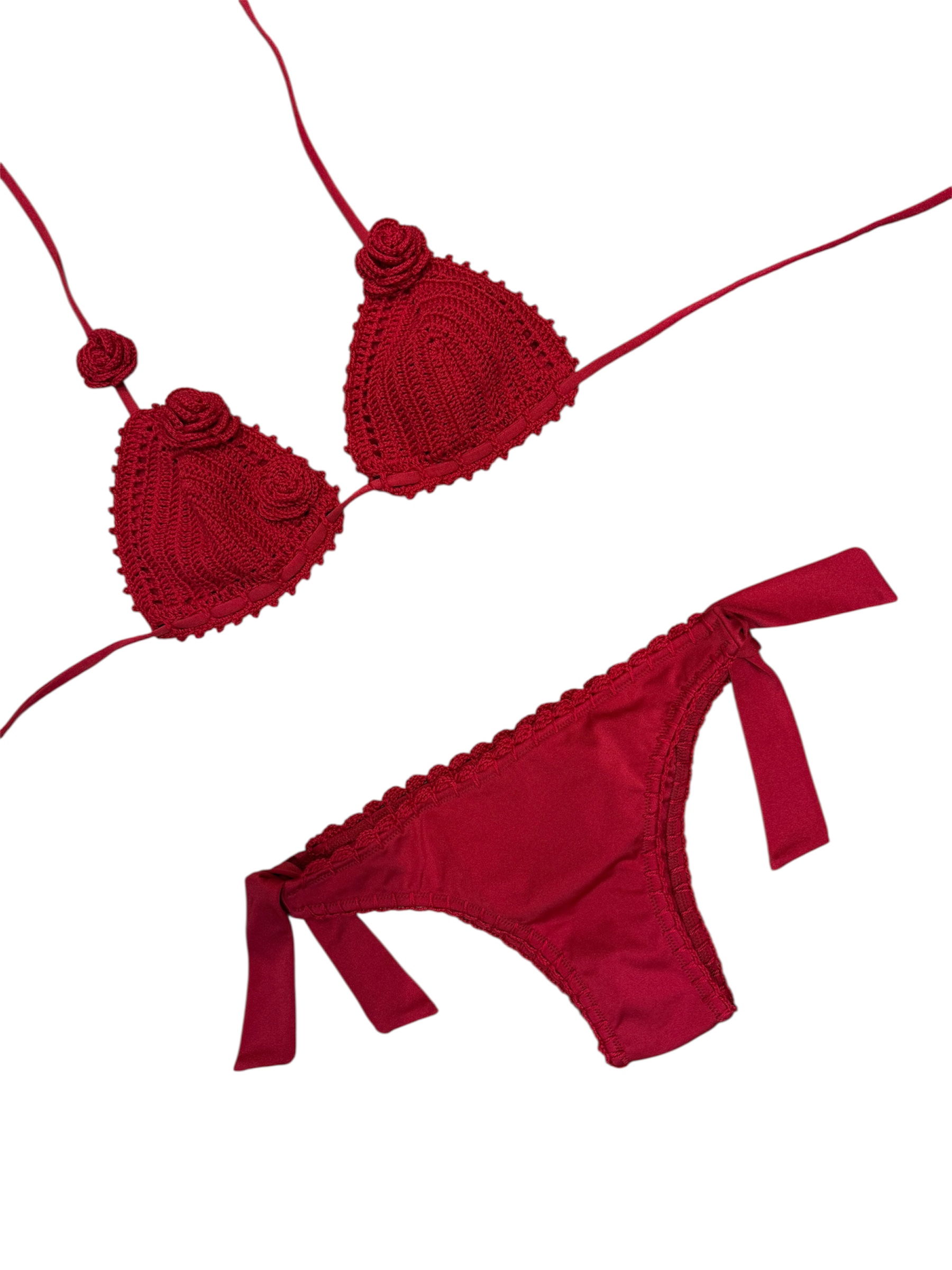 il reggiseno ha una base in lycra e sopra è applicata la coppetta ad uncinetto fatto tutto a mano con applicazione di rose rosse.