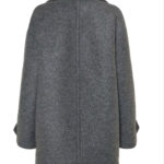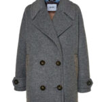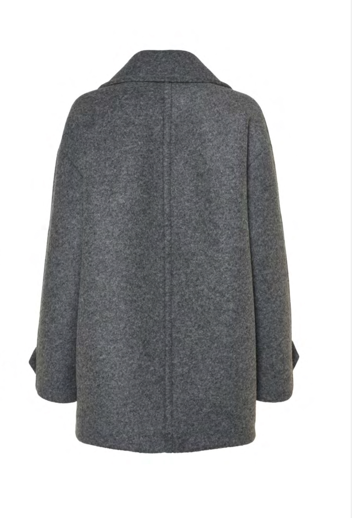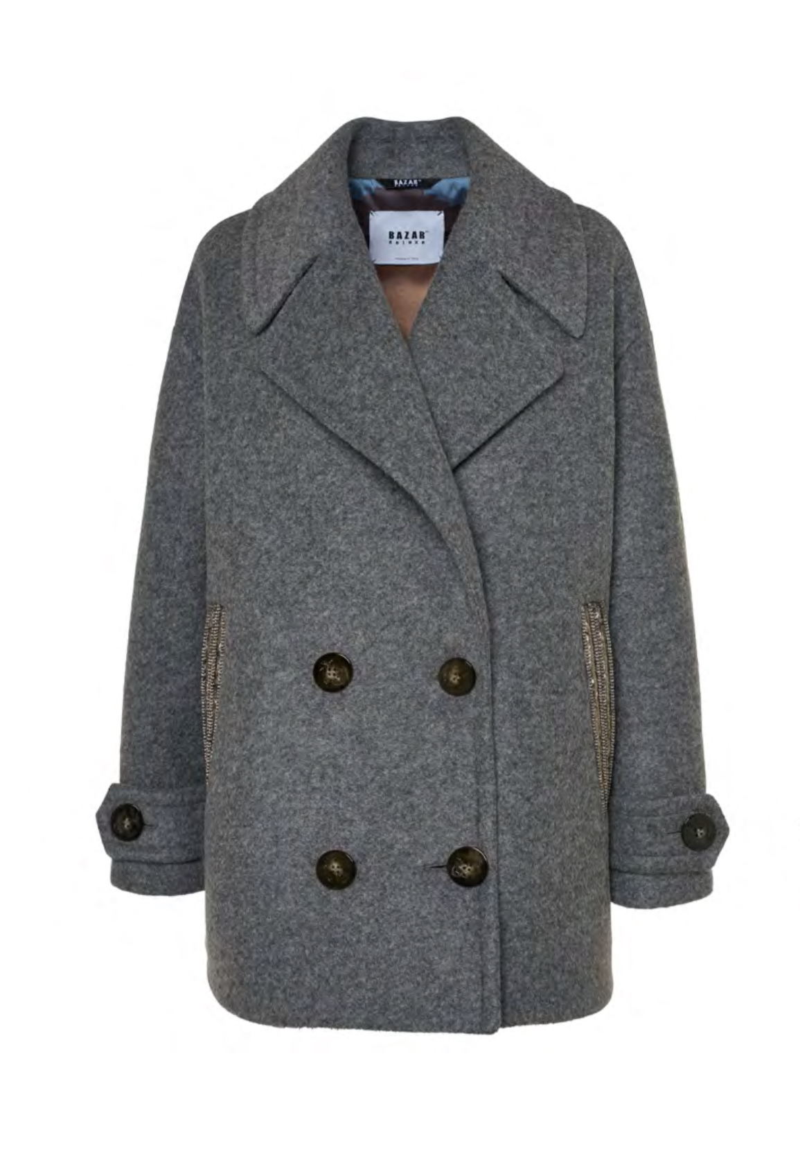 Caban doppio petto grigio perla con dettagli di ricami sulle tasche.