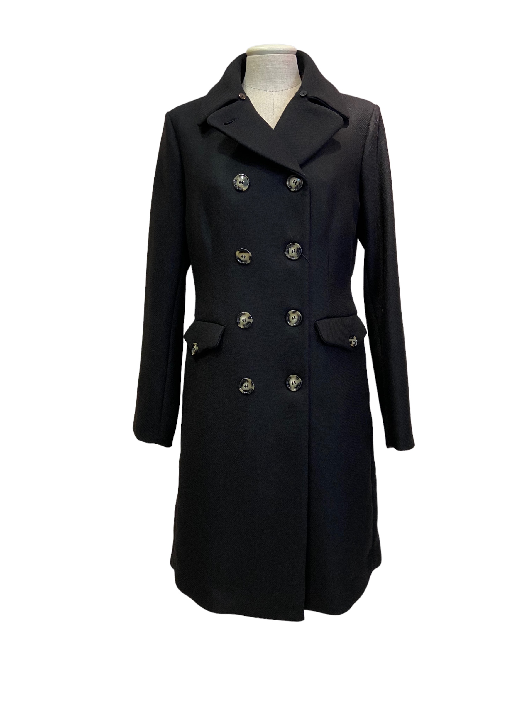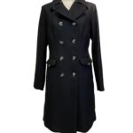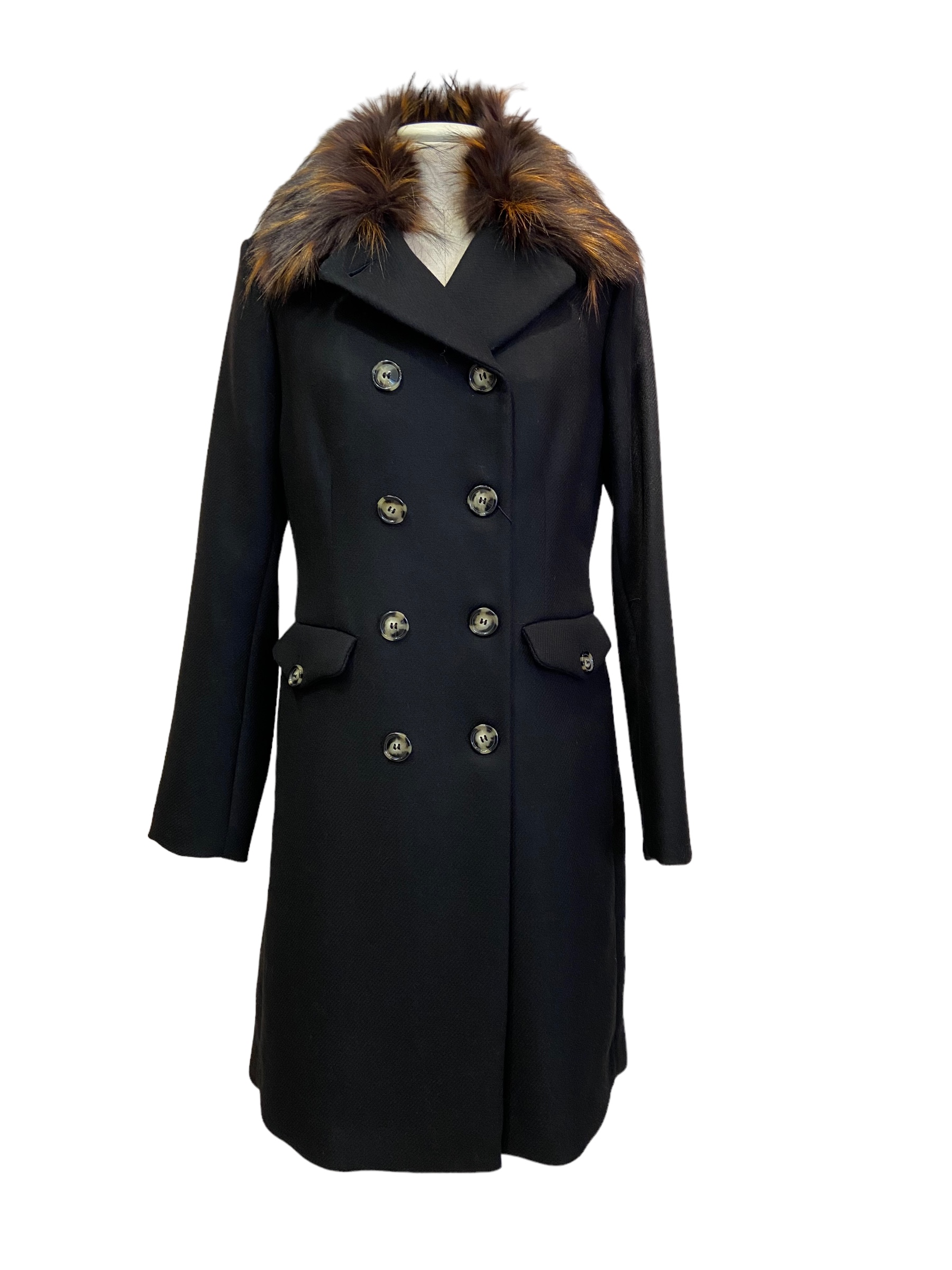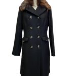 Cappotto doppiopetto nero con collo in eco pelliccia staccabile.