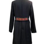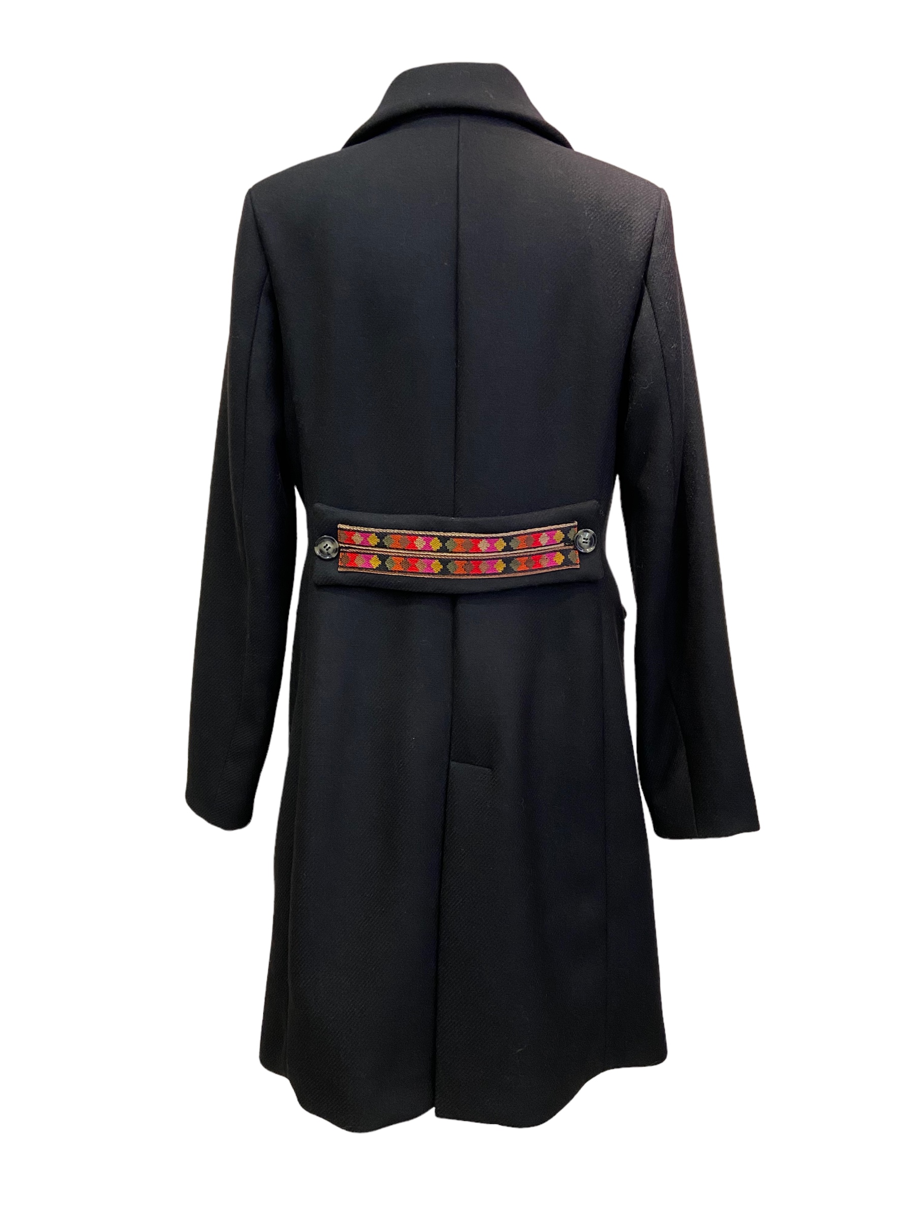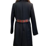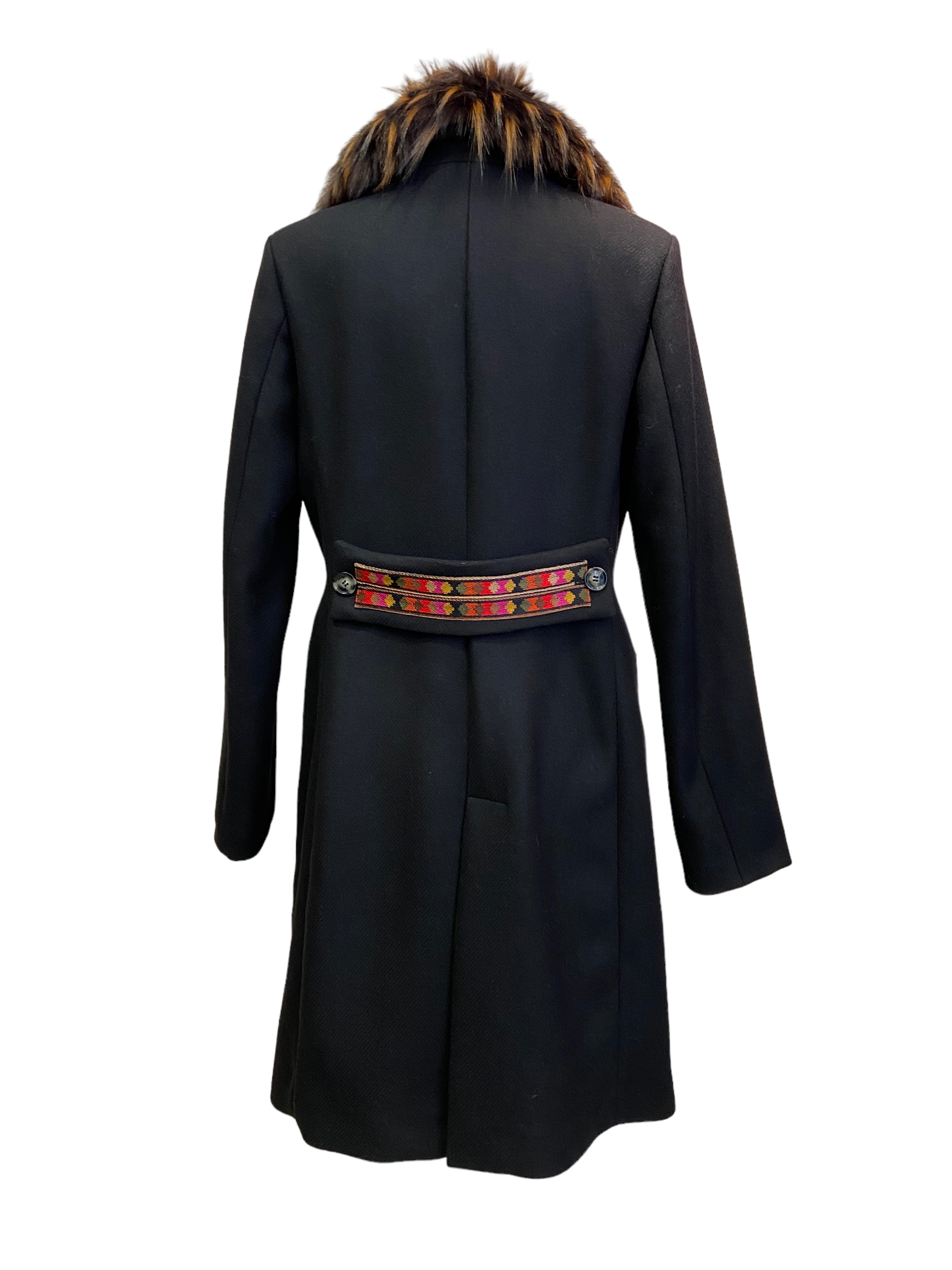 Cappotto sfoderato doppiopetto in lana con martingala con ricamo etnico. Collo in pelliccia ecologica staccabile. Colore nero.