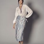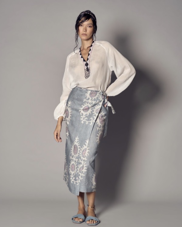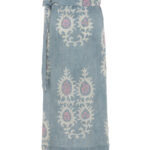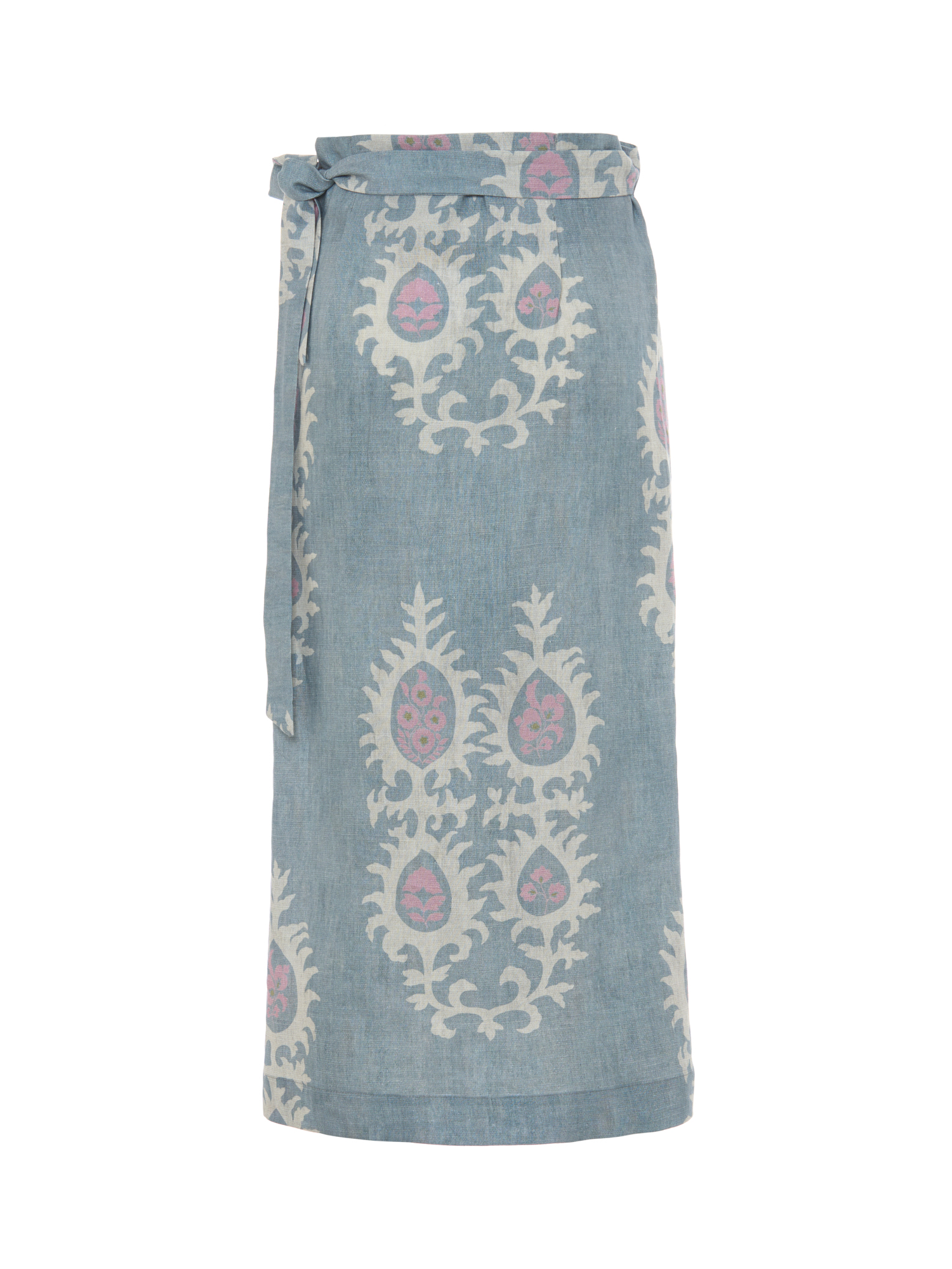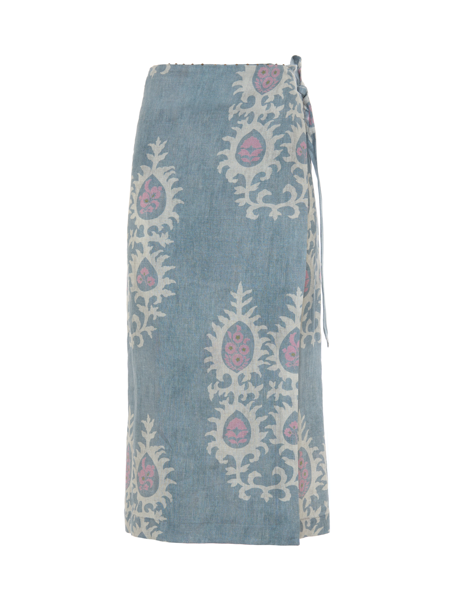 Gonna pareo in lino, stampa balinese su fondo azzurro .
