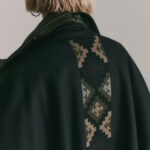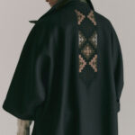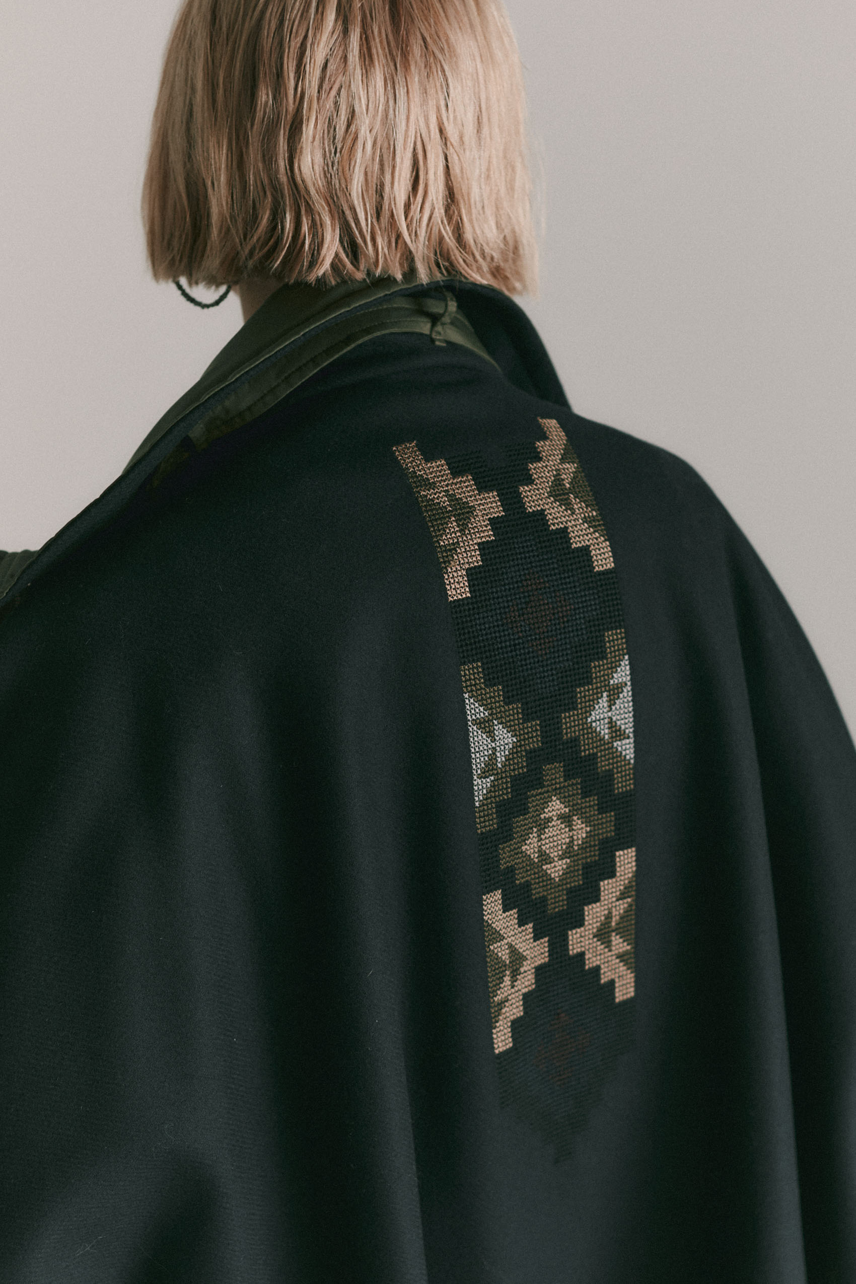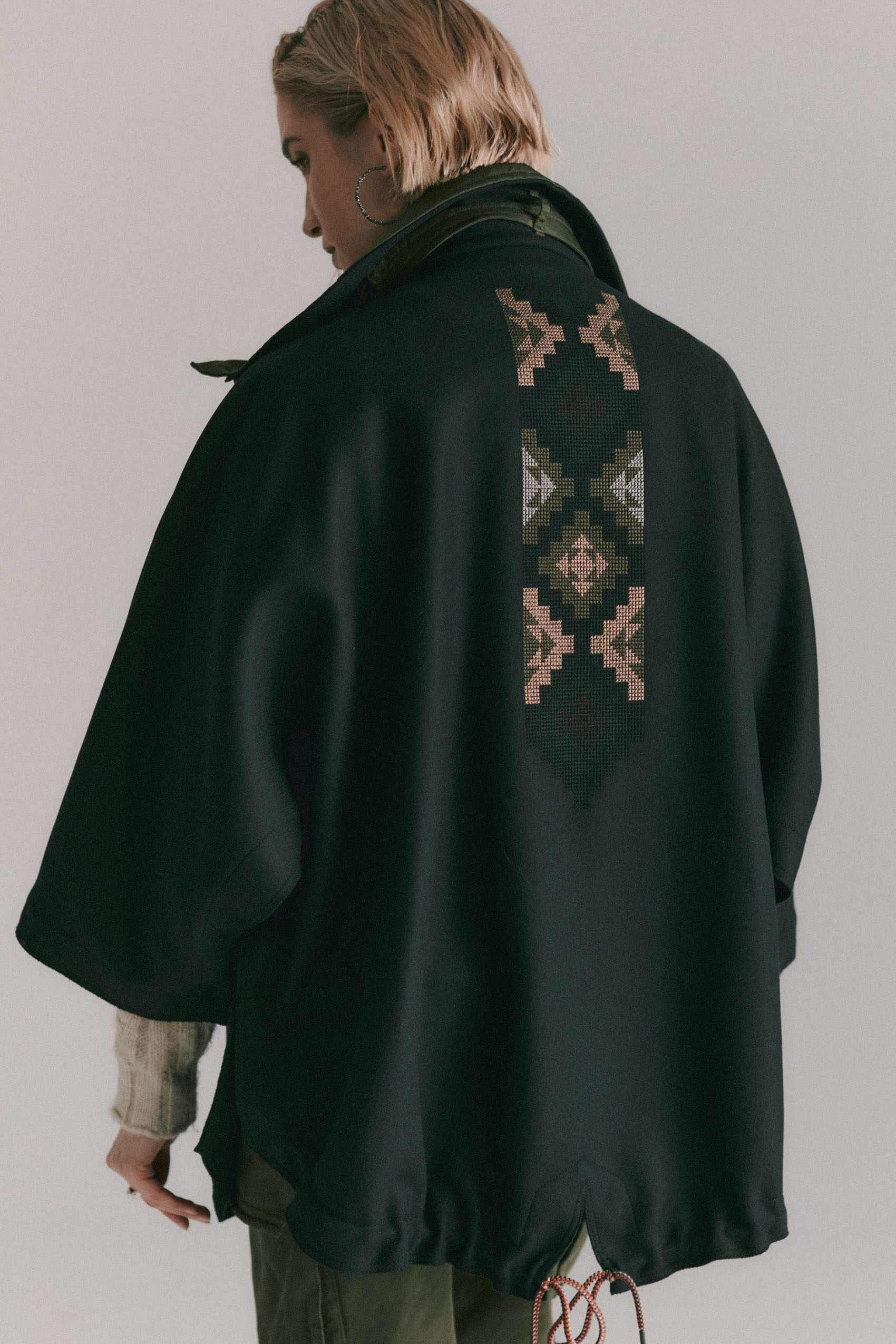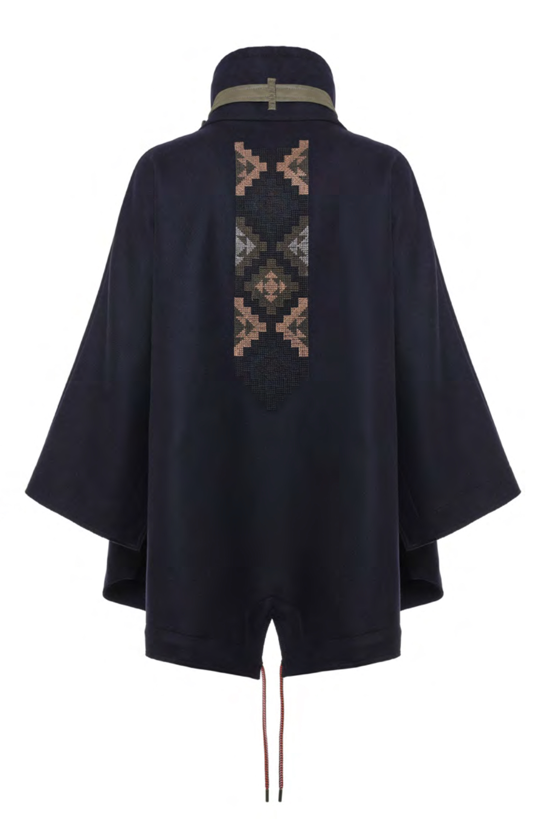 Mantella corta ricamata sul retro in lana con dettagli e collo in Nylon (tessuto tecnico).