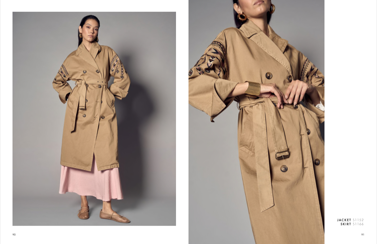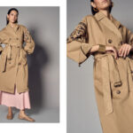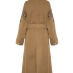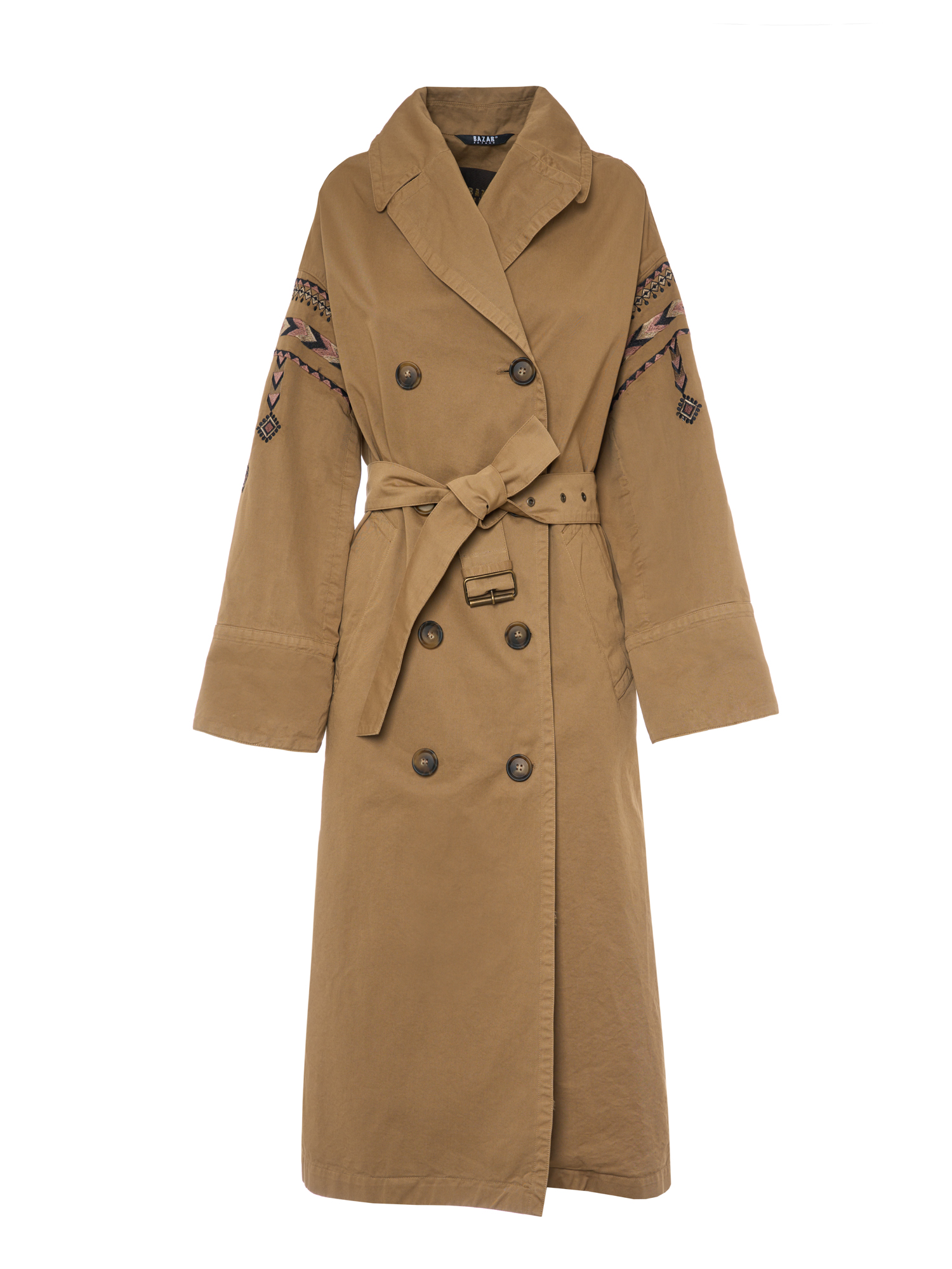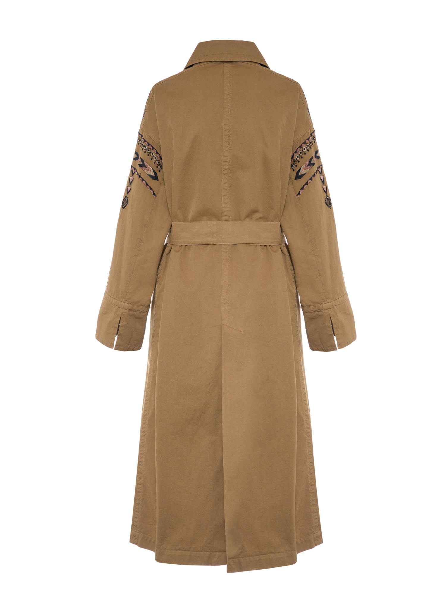 Trench in cotone tinto capo, doppio petto con cintura, e maniche ricamate.
