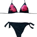 Bikini triangolo imbottito con prezioso ricamo di rosa rossa su fondo nero.