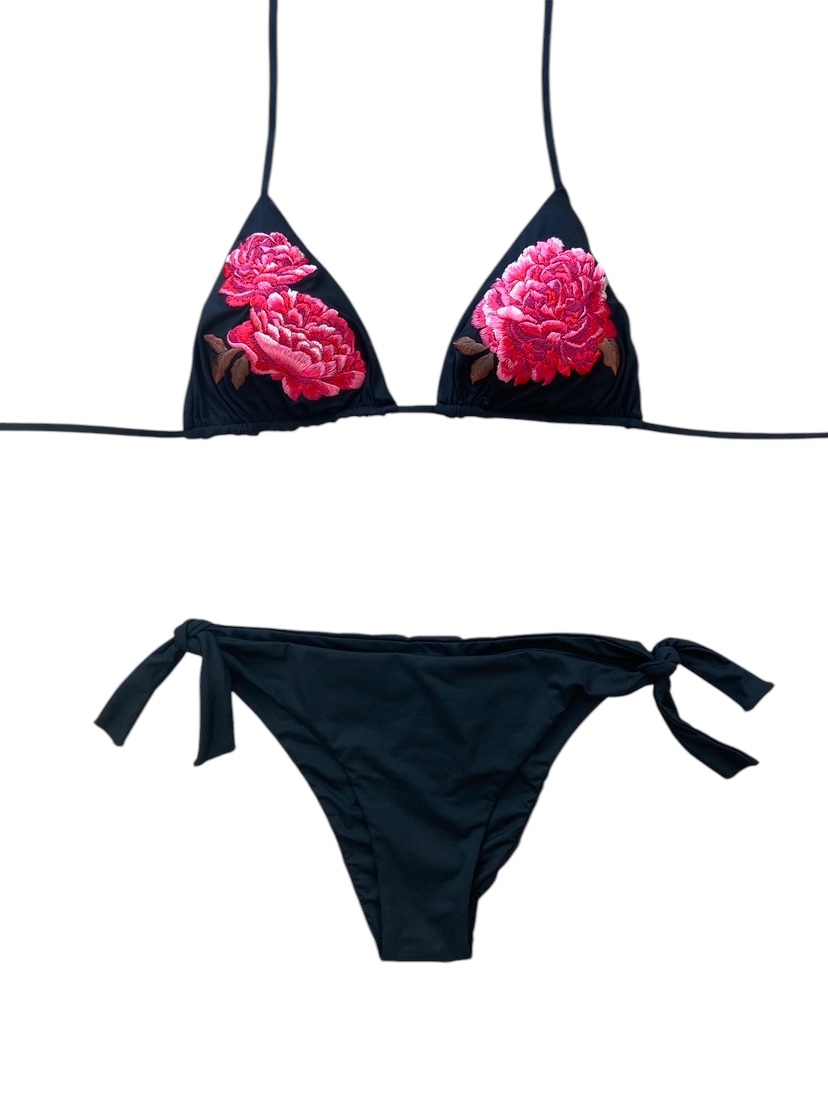 Bikini triangolo scorrevole con imbottitura estraibile, tinta unita nero con prezioso ricamo di fiore di rosa su entrambe coppe del reggiseno.