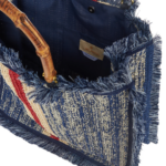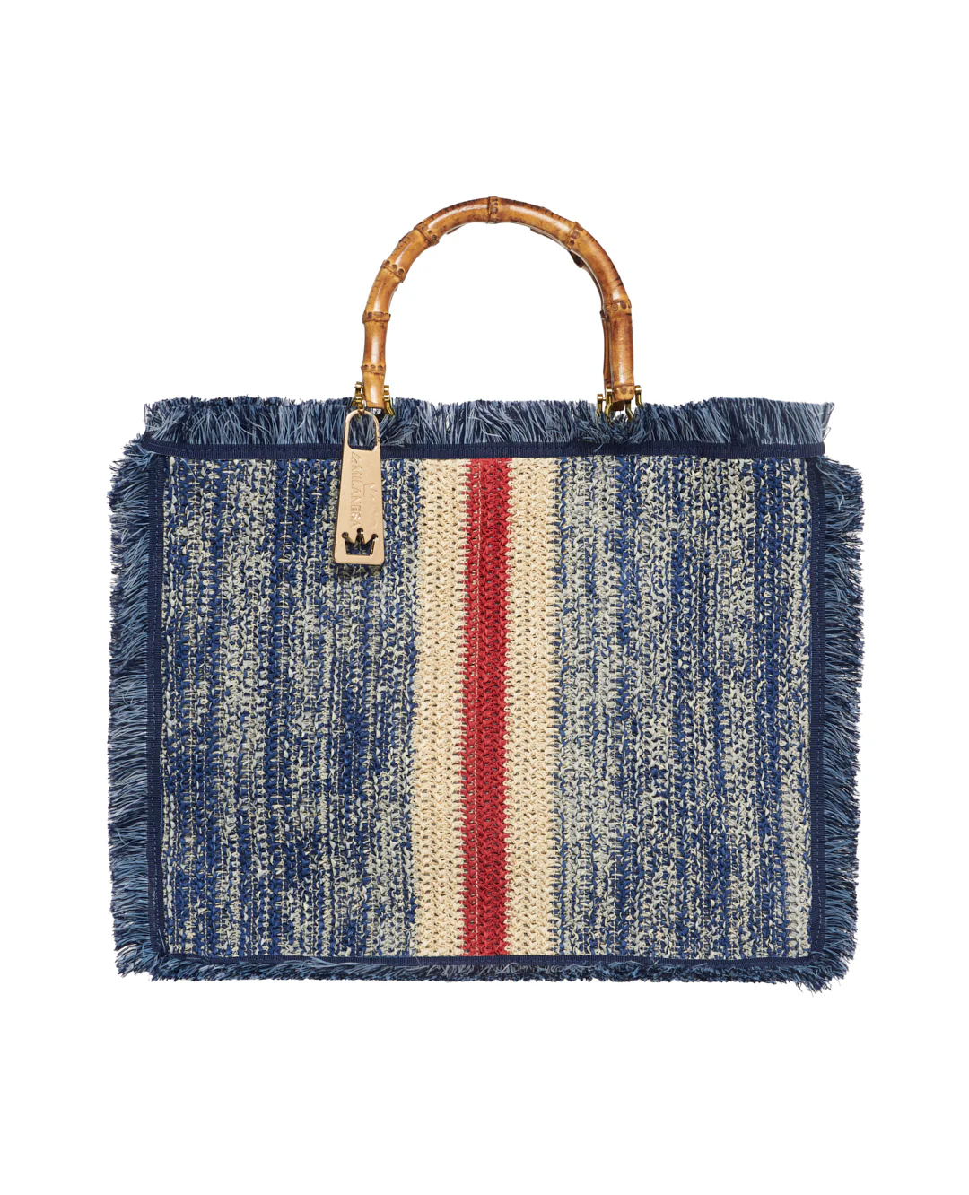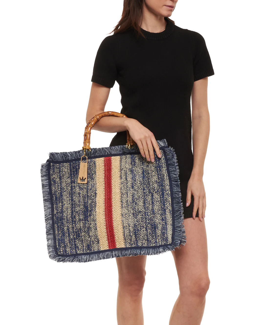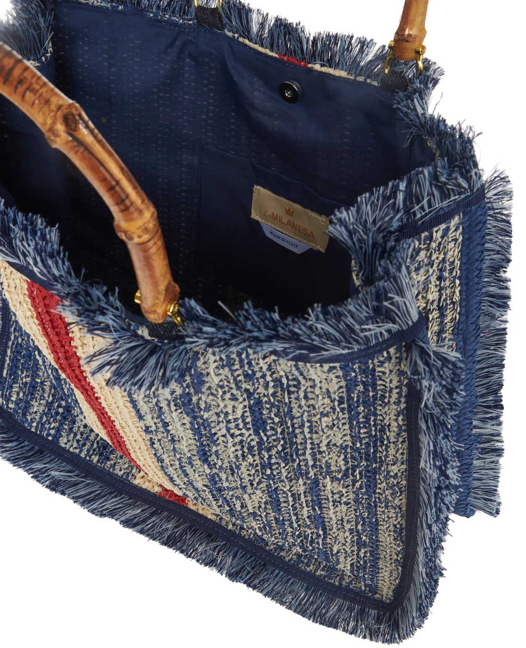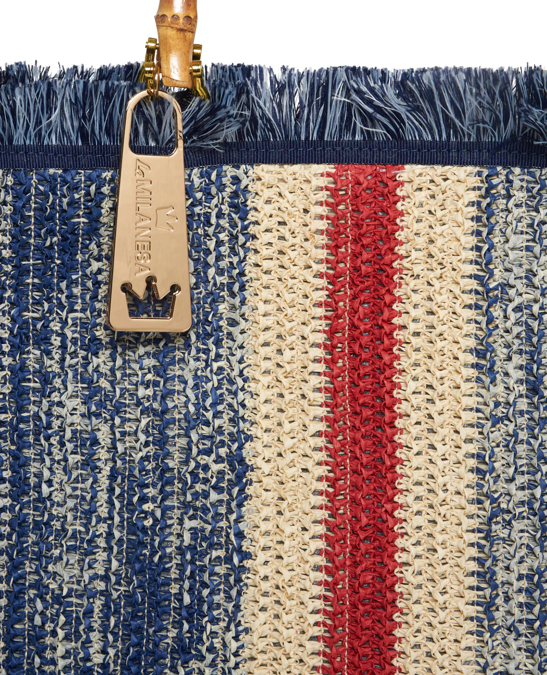 Borsa ortensia large in rafia con frange laterali in cotone e manici in bamboo.