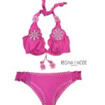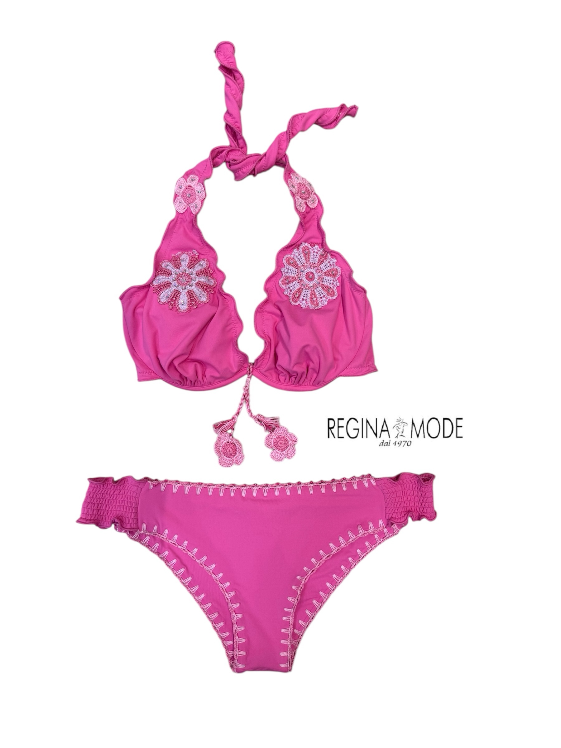 Bikini ferretto coppa C, colore fuxia, con bordi sbambolati da allacciare dietro il torace e il collo, dettagli crochet.
