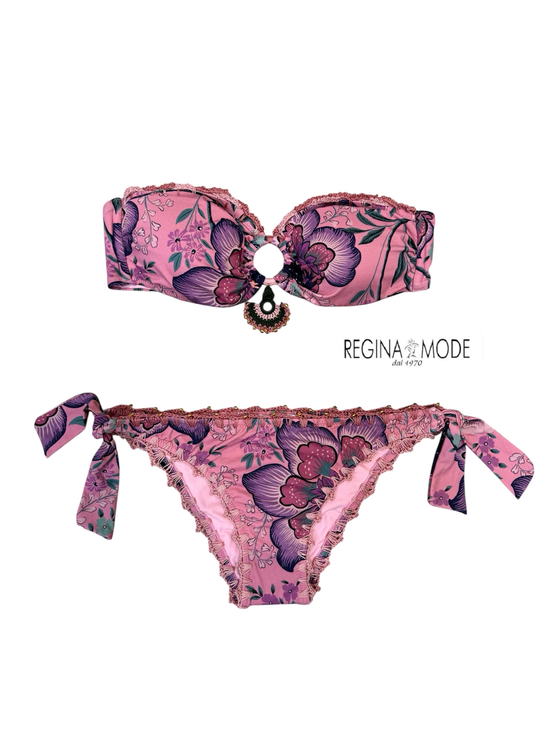 Bikini Fascia stampa fiori su fondo rosa antico, imbottitura estraibile con accessorio e dettagli crochet in centro seno, lavorazione artigianale 100% made in Italy.  Slip con fiocchi laterali.