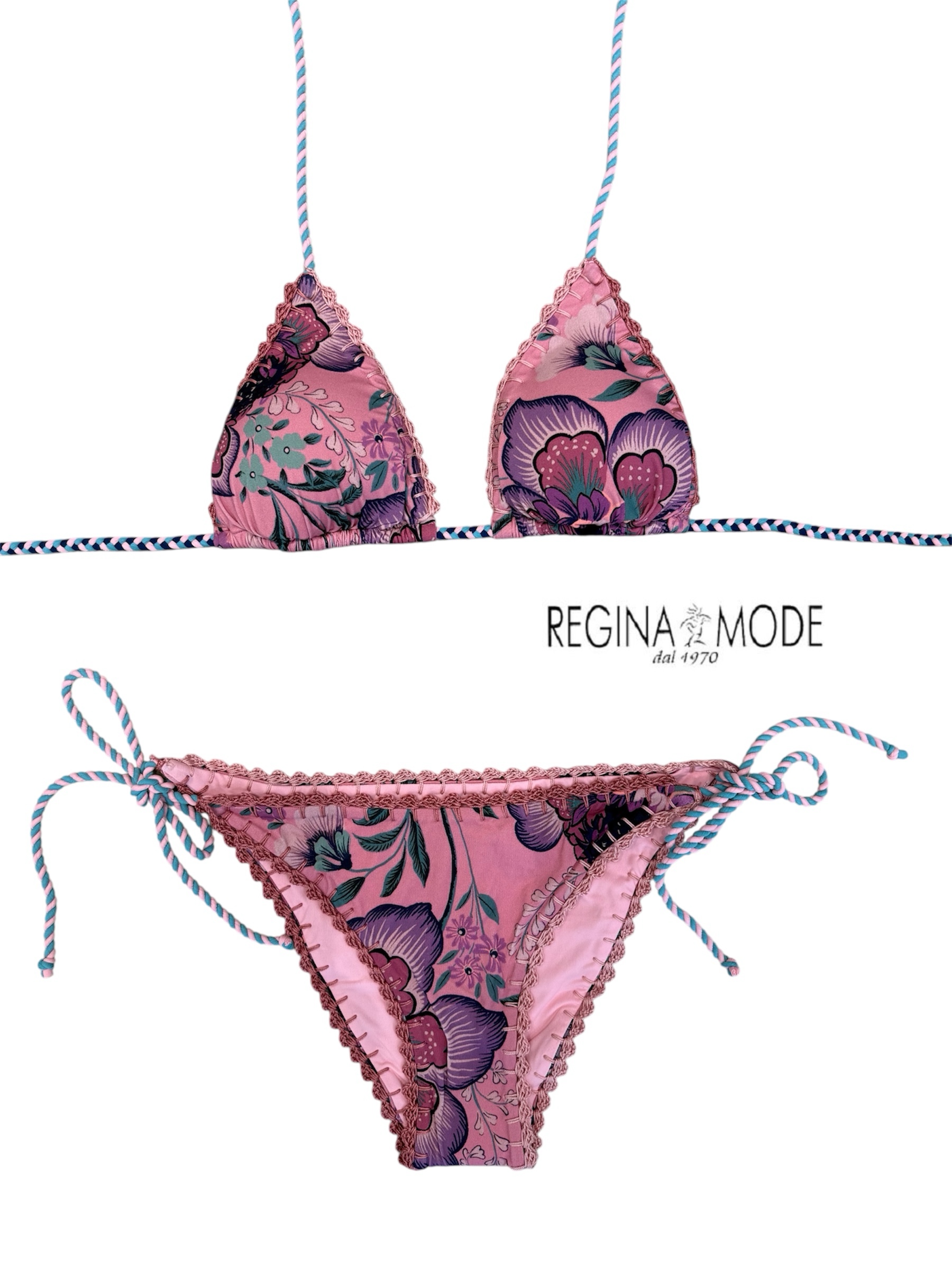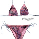 Bikini triangolo con imbottitura estraibile stampa su fondo rosa con dettagli e rifiniture a crochet.