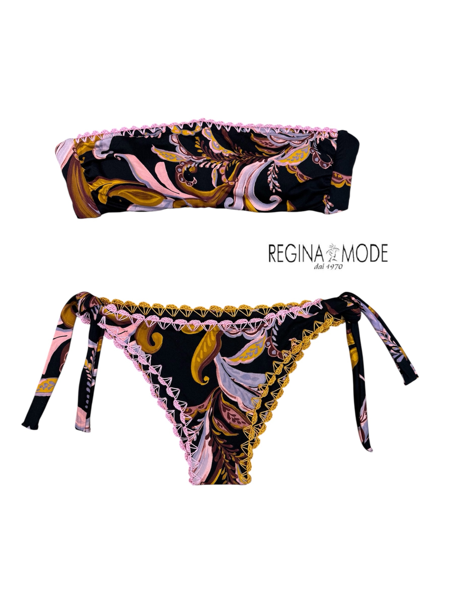 Bikini fascia con imbottitura estraibile slip con fiocchi stampa su fondo nero, rifiniture e dettagli crochet fatti a mano .