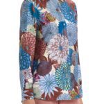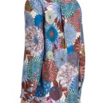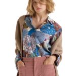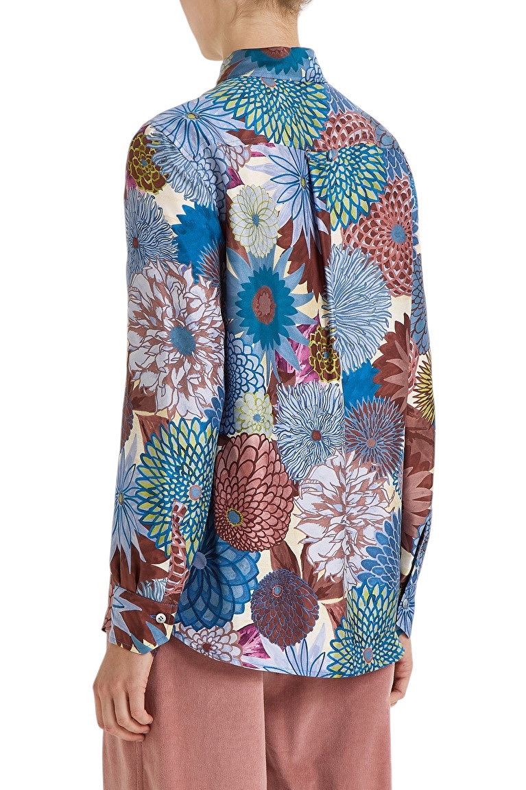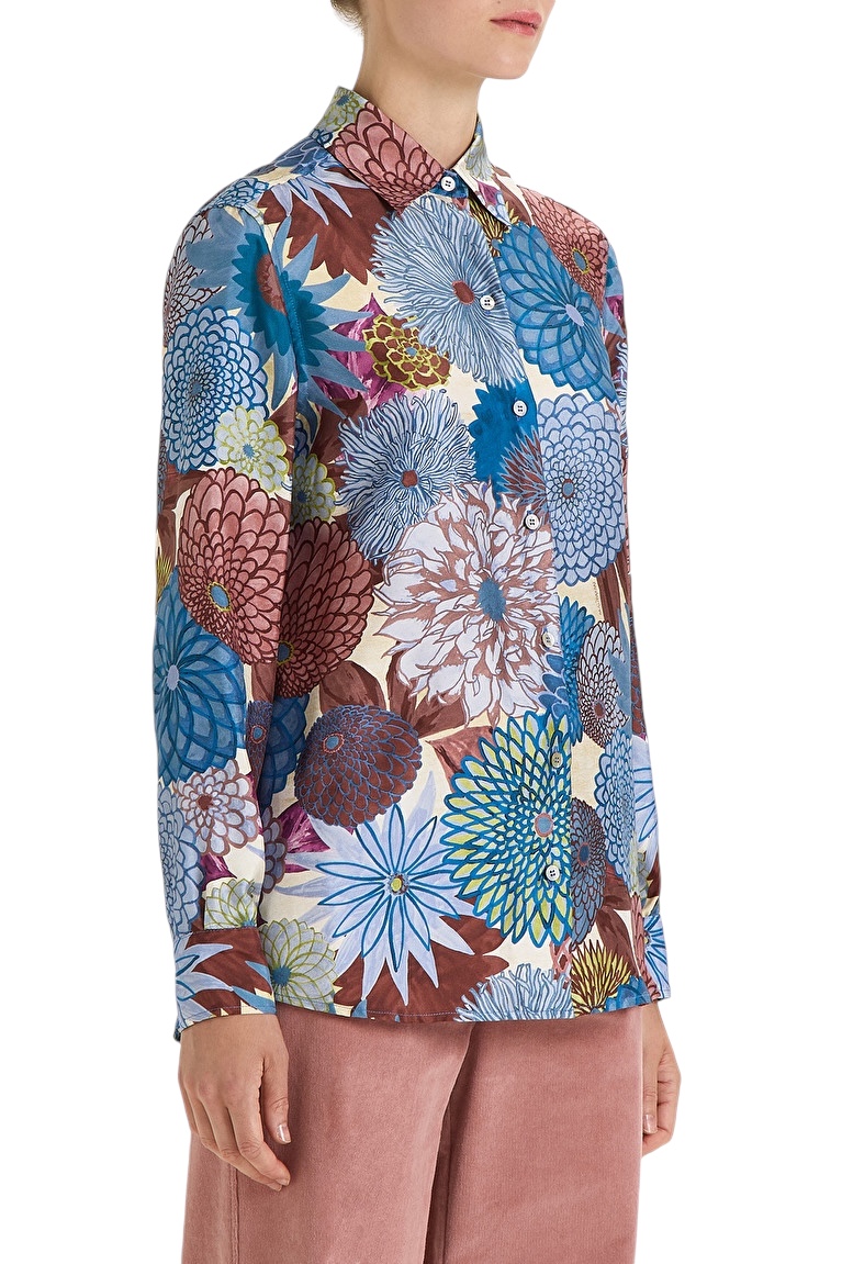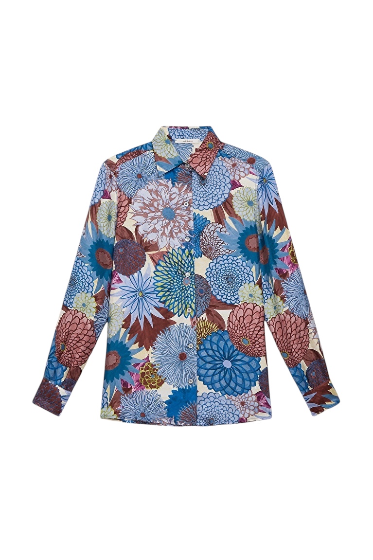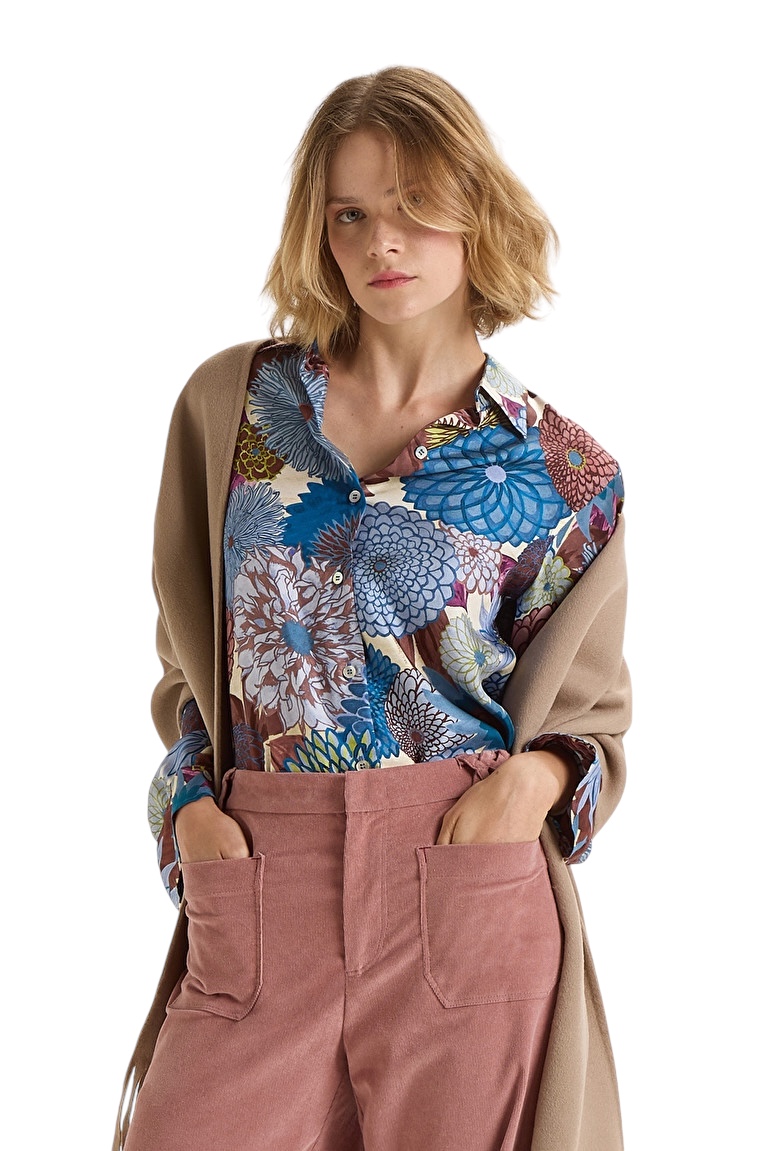 Camicia in seta con collo abbottonata davanti con stampa nei toni dell’azzurro marrone e verde.