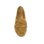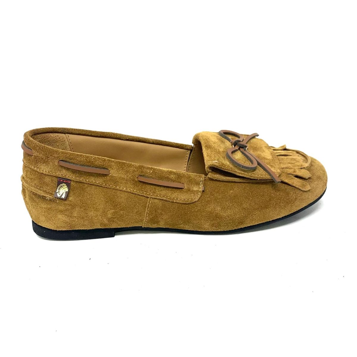 La Dakota è un mocassino scamosciato, con soletta memory soffice e confortevole, verrà consegnata all’interno di una bellissima Pochette color avorio con frange.