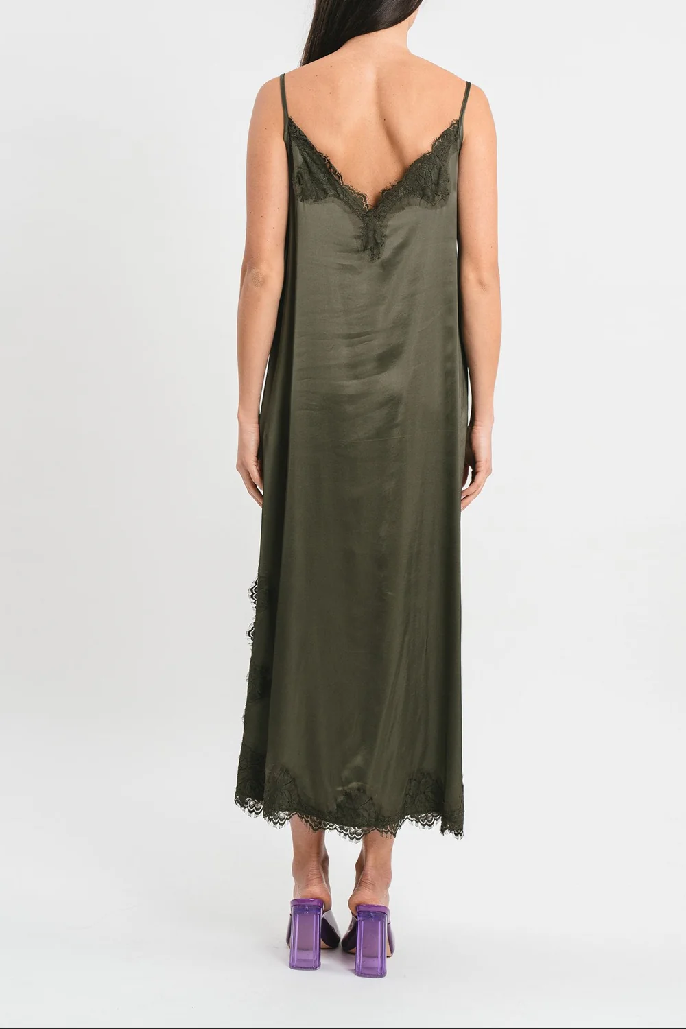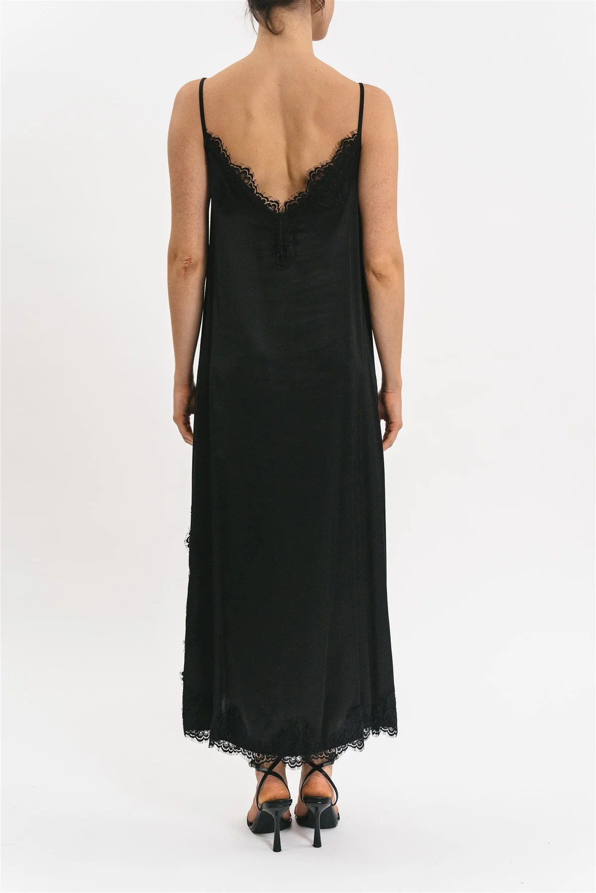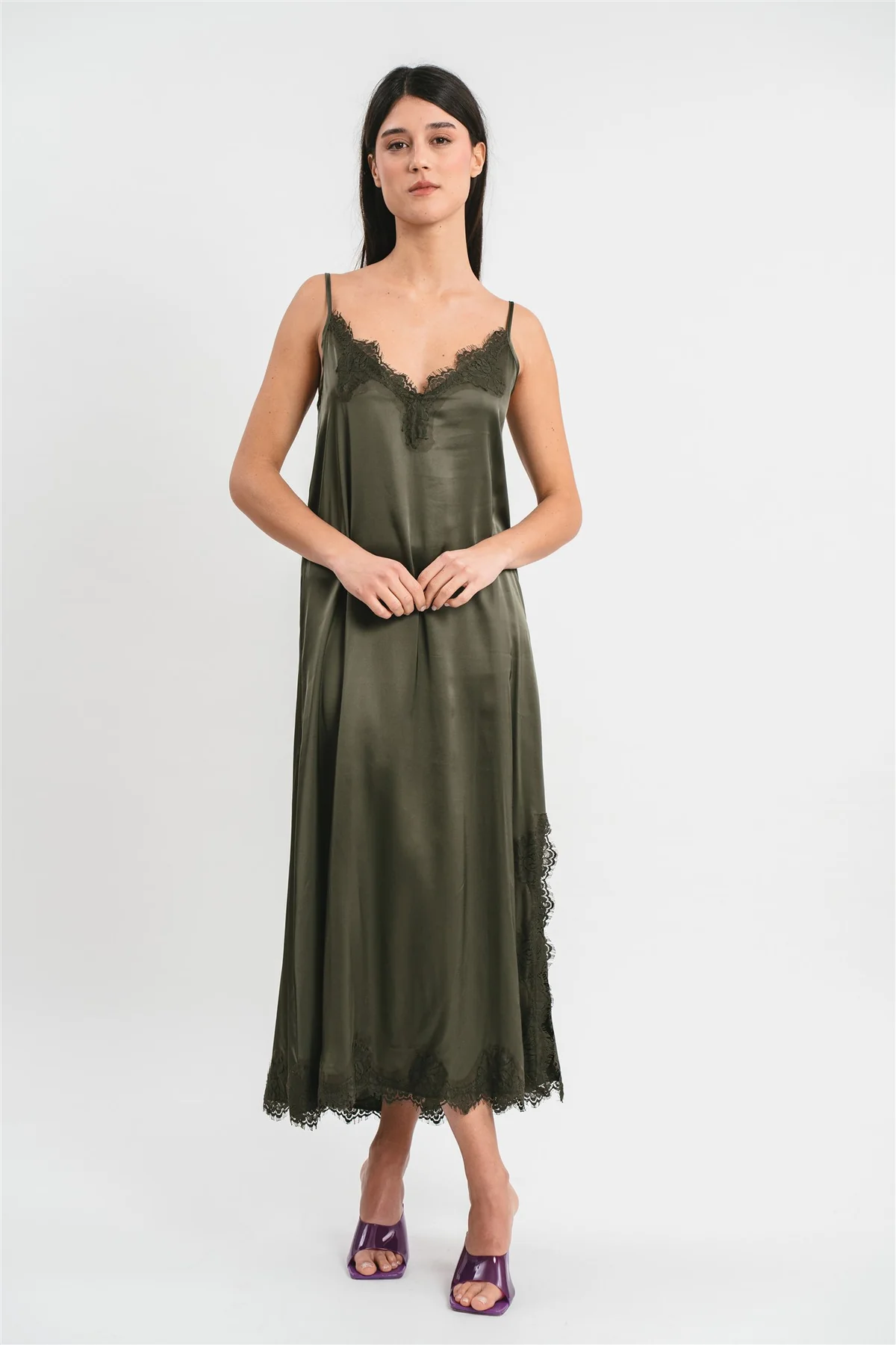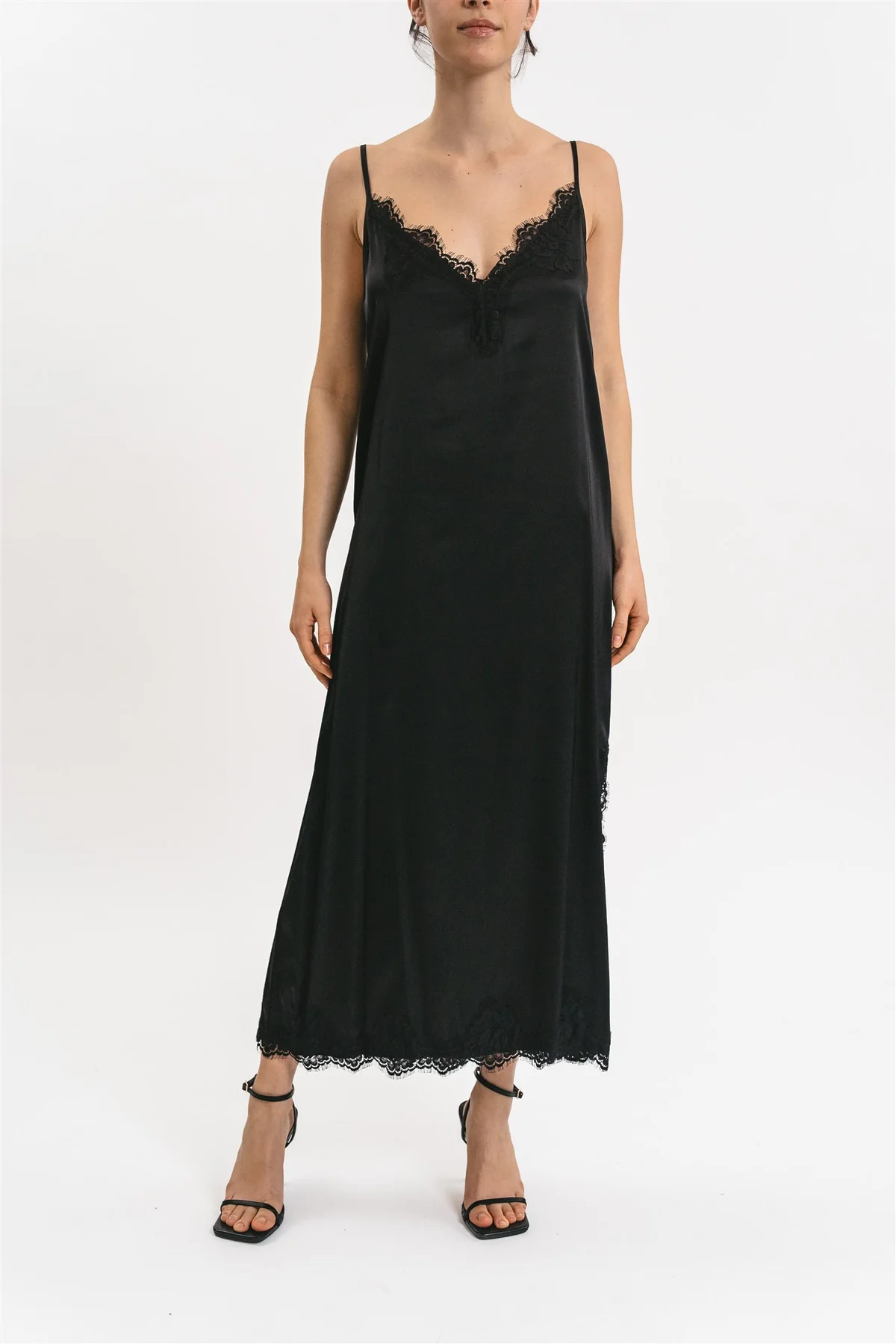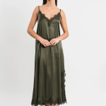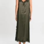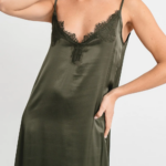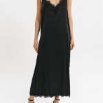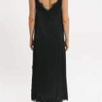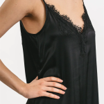 Abito sottoveste Matilda longuette in viscosa satin elasticizzata con rifiniture in pregiato pizzo francese. La vestibilità è morbida con spacco laterale e rifiniture in pizzo francese.