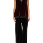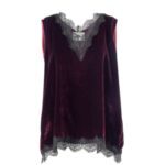 Top spalla larga in velluto bordeaux bordato di pizzo nero.