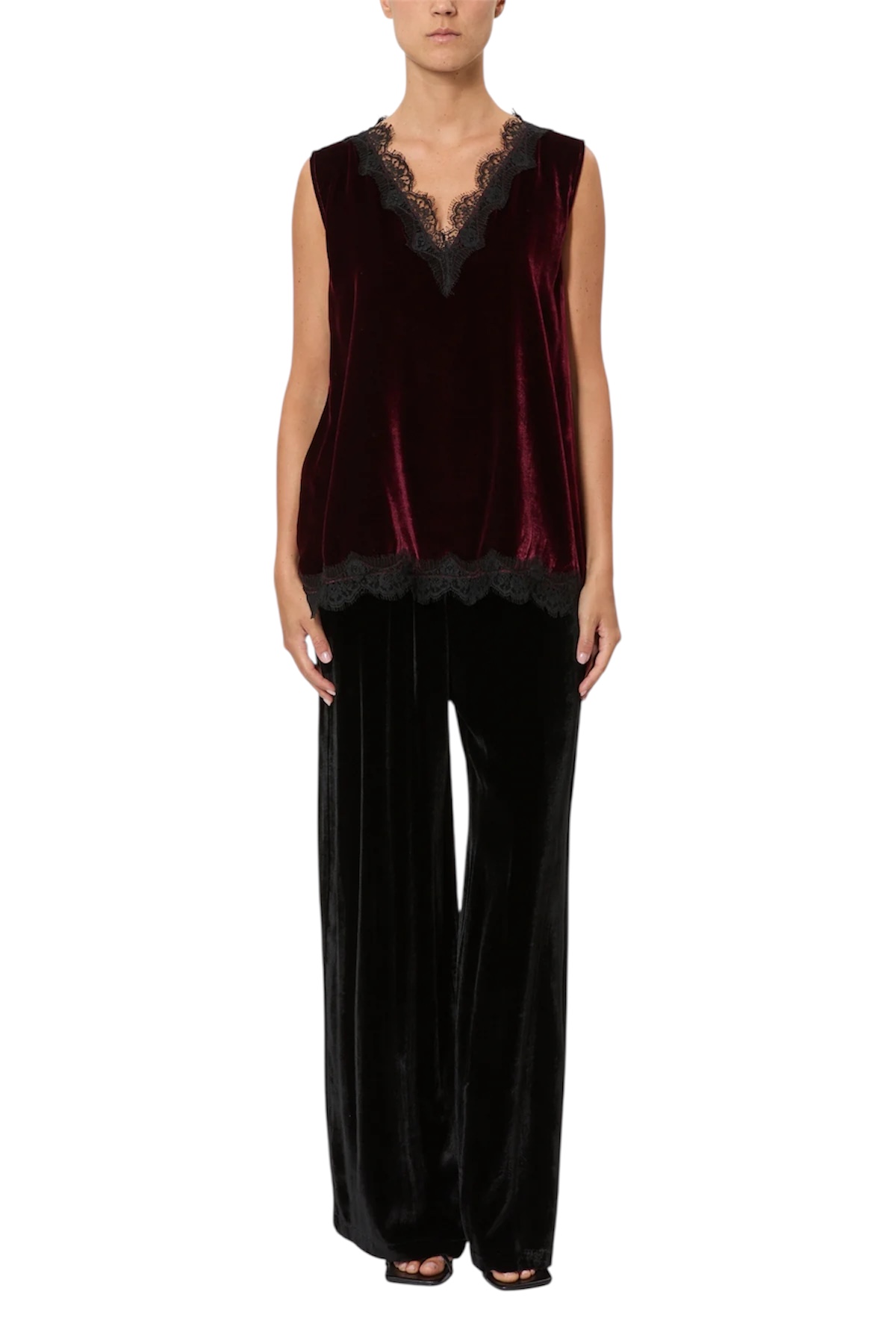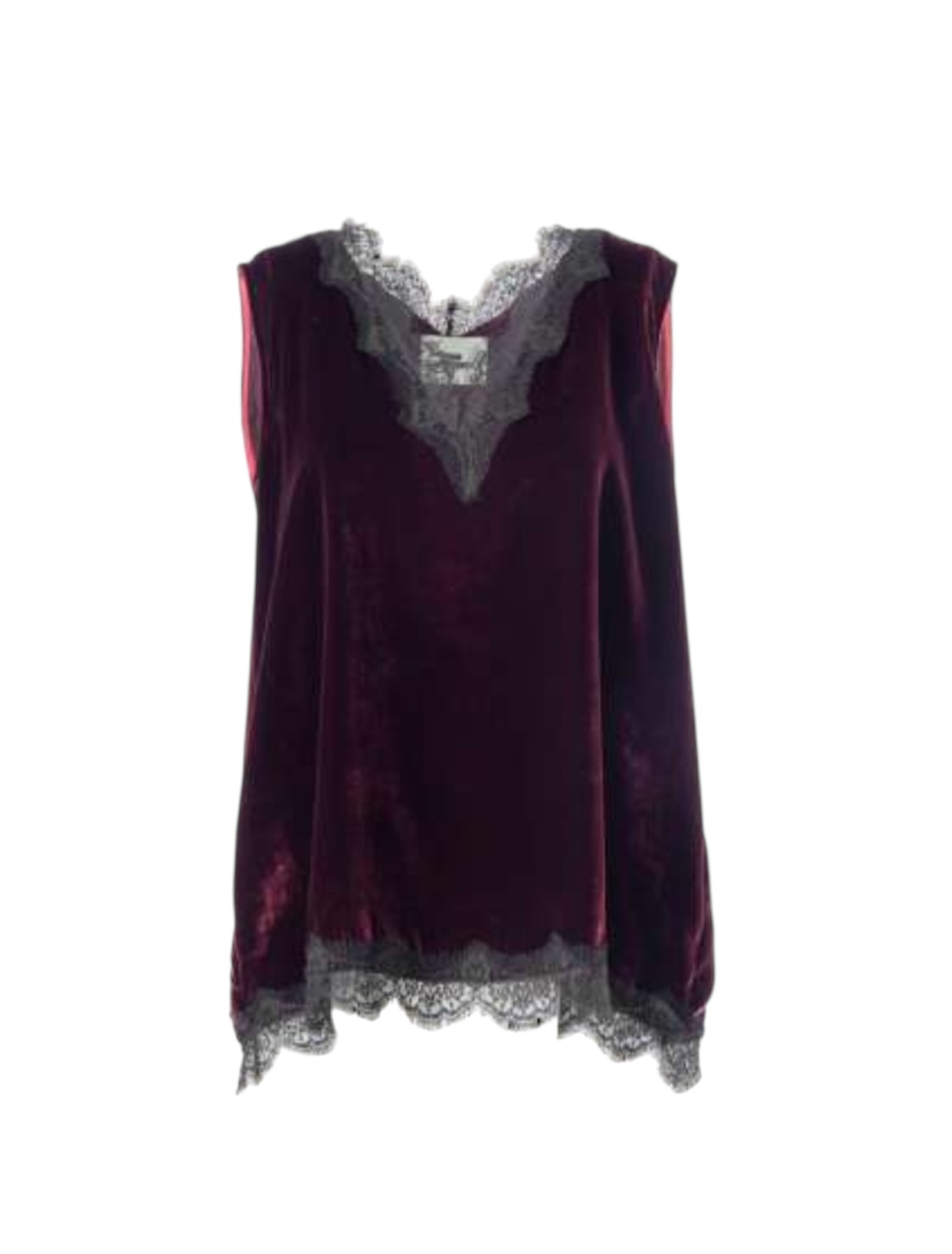 Top in velluto bordeaux spalla larga con pizzo nero sulla scollatura a V e sul fondo.