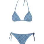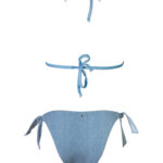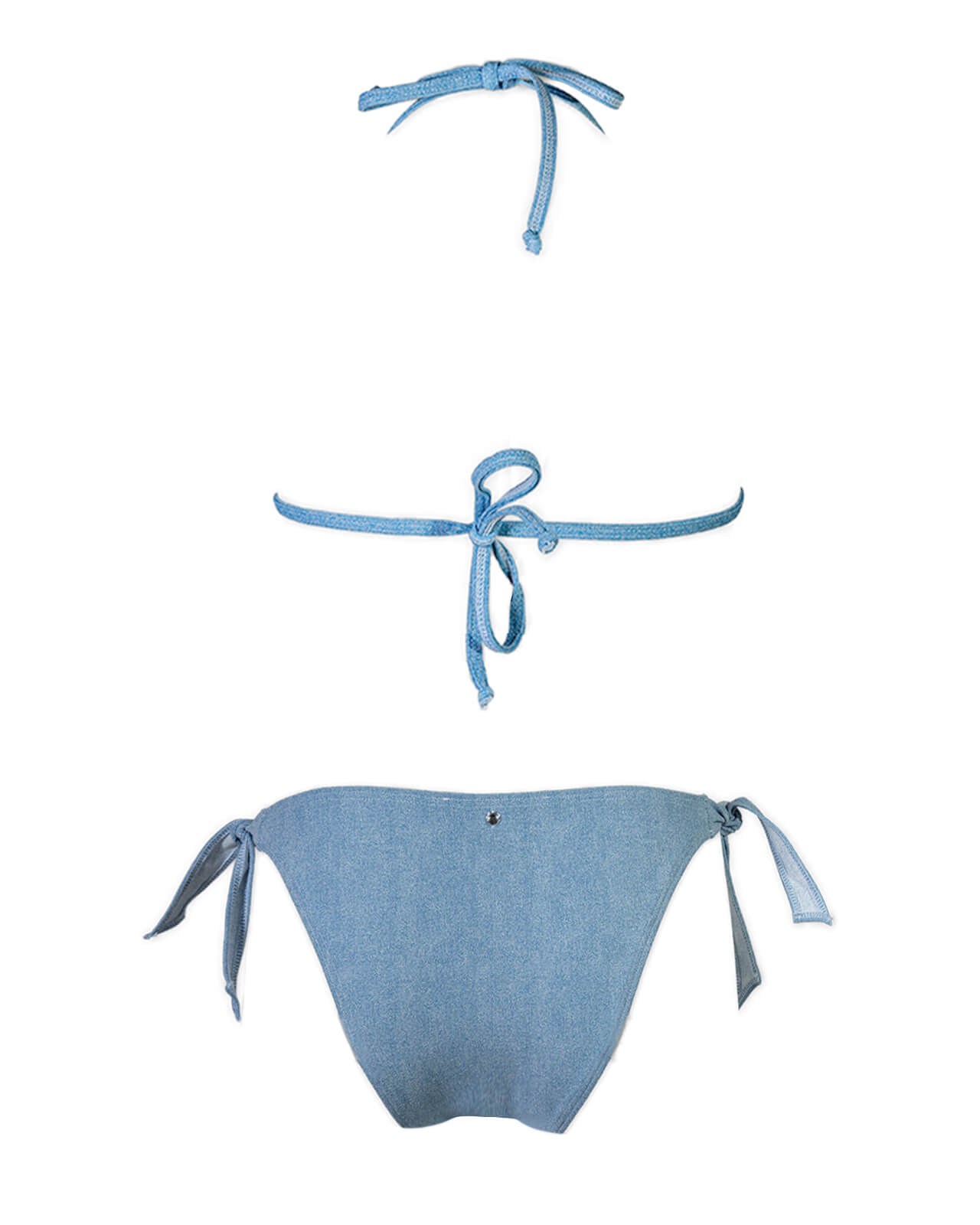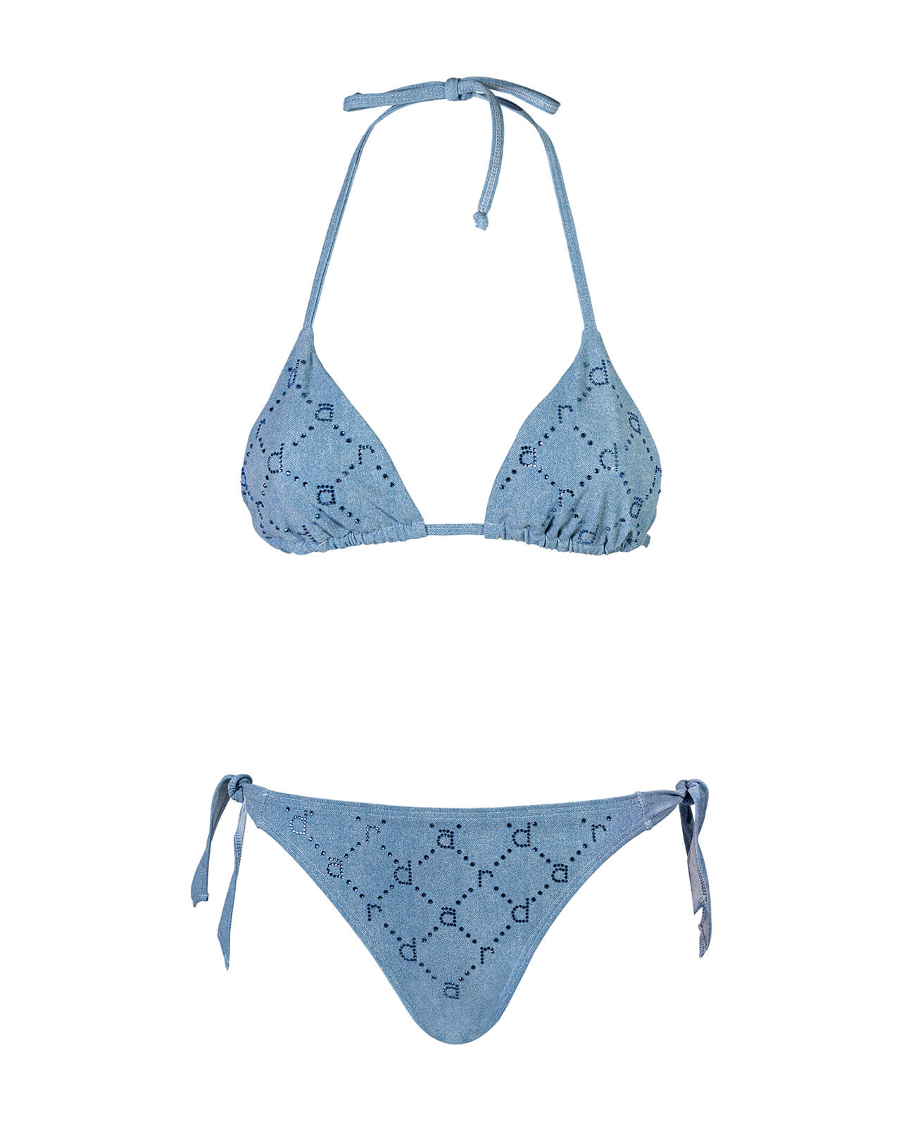 Bikini triangolo con imbottitura estraibile lycra effetto denim con strass. Slip con laccetti laterali copertura regolare.
