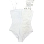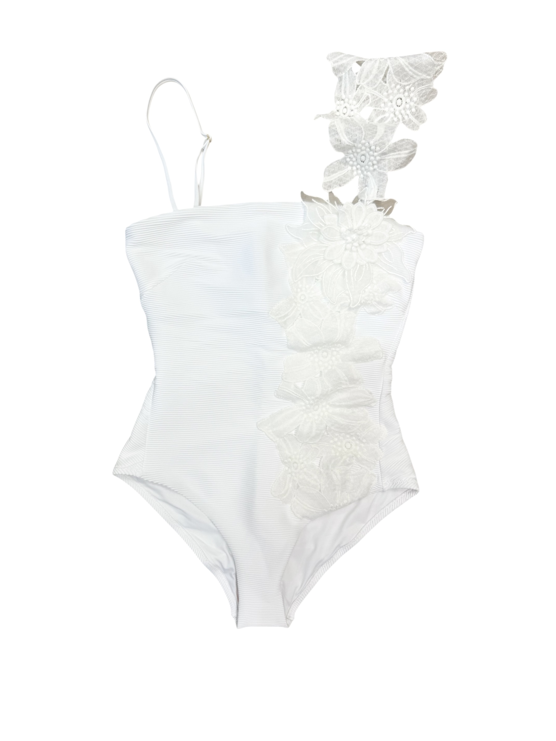Costume intero a top, in lycra ottoman con dettagli di fiori in organza e macramรจ su un lato e lungo una spallina.