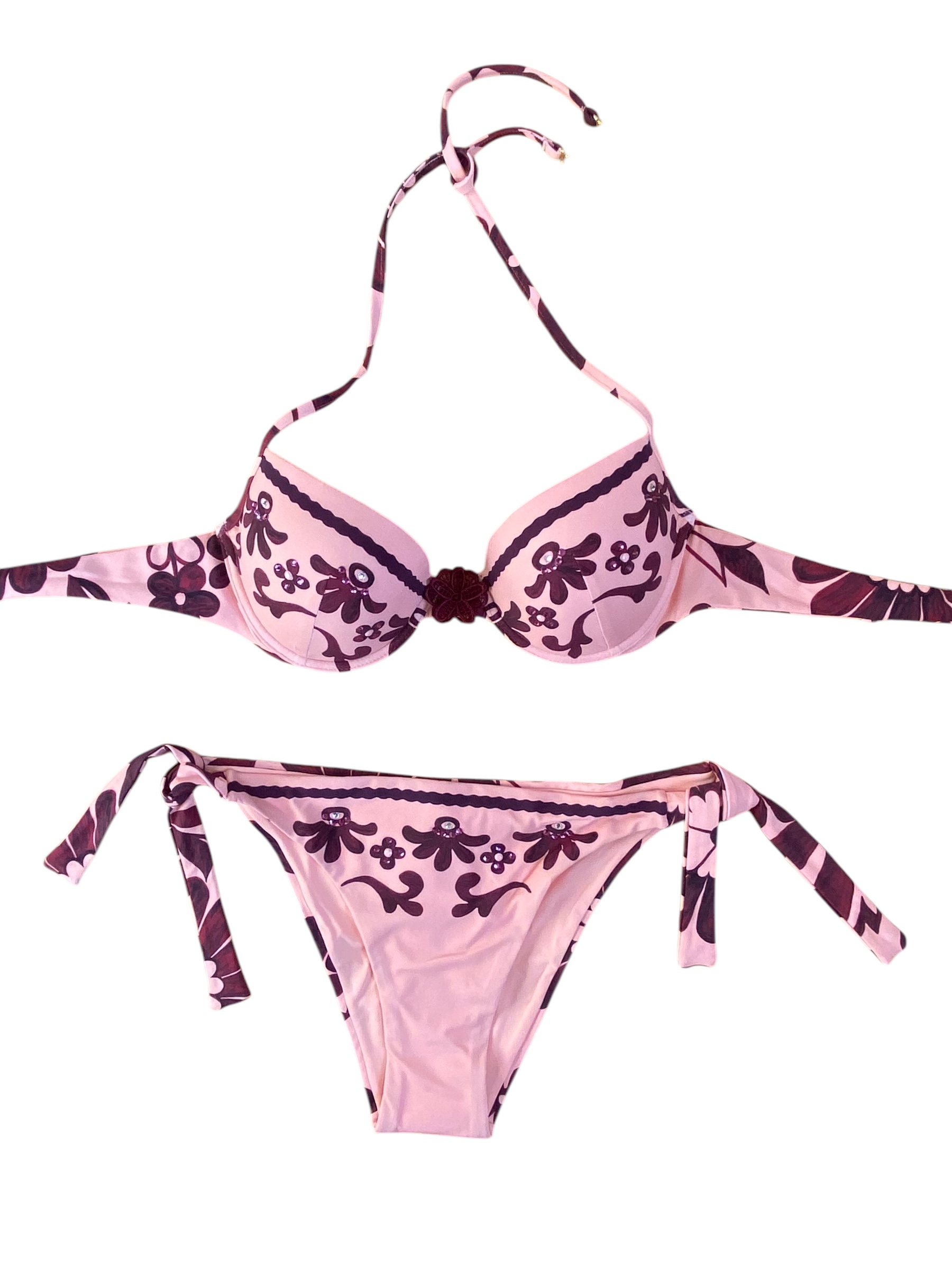 Bikini Push-Up con lunette estraibili allacciatura regolabile con lacci, stampa piazzata bordeaux su fondo rosa con dettagli di strass e fiore macramè in centro al reggiseno, ideale per valorizzare il seno. Lo slip a brasiliana con stampa piazzata e strass davanti, ha lacci laterali